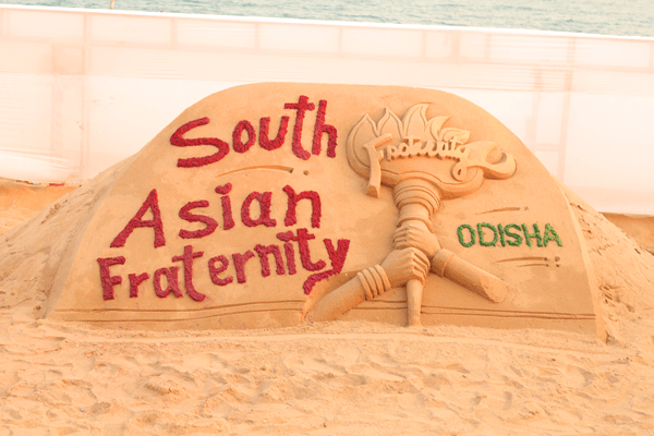 Himanshu Sekhar Parida created a sand sculpture at the South Asian Conference in Odisha depicting the SAF logo as a call for unity and progress.
